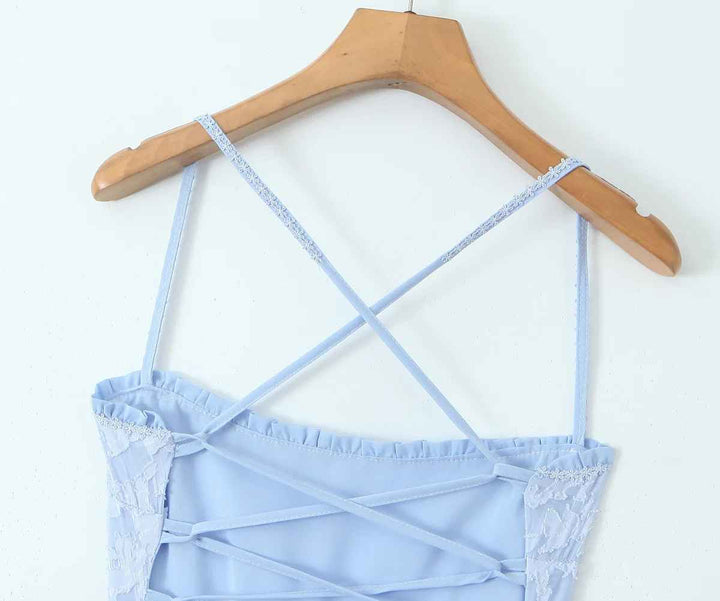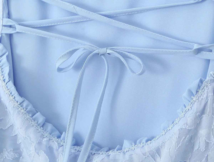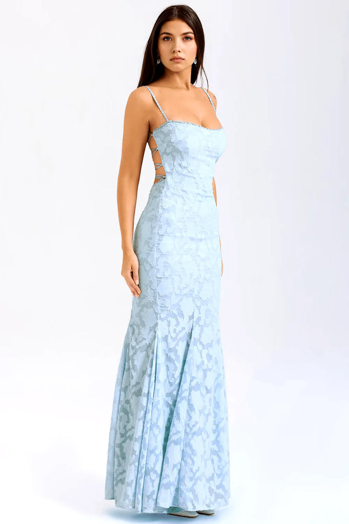 Azul-sereno em jacquard floral, alças finas e silhueta que abraça o corpo antes de fluir com elegância.