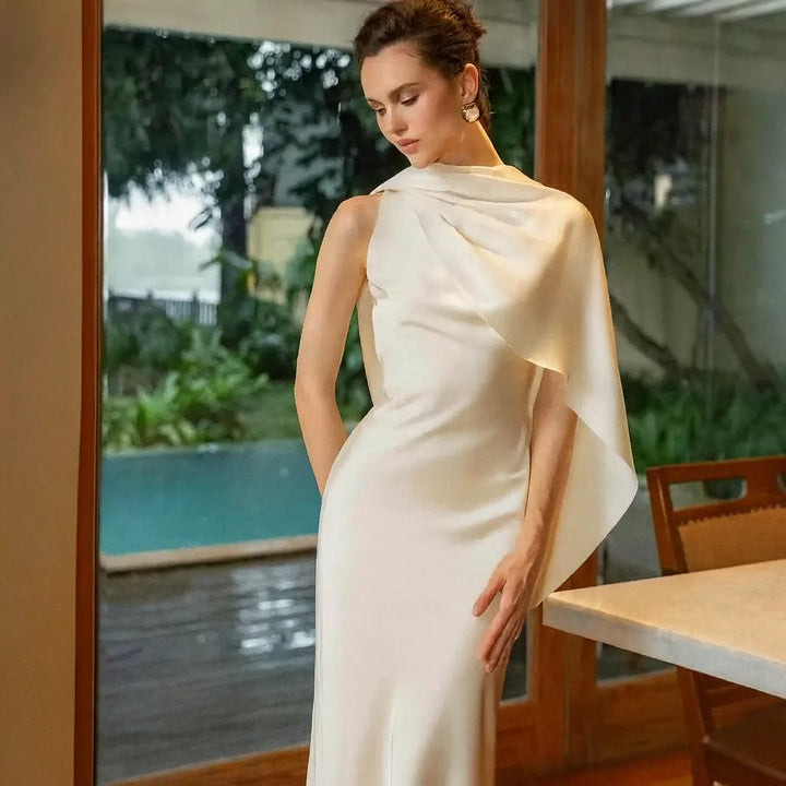 O Vestido Longo Branco Aurora é a escolha perfeita para mulheres que buscam elegância minimalista e atemporal. Com decote assimétrico de um ombro só e drapeado diagonal com painel fluido em cascata, esta peça em off-white luminoso transmite sofisticação discreta e garante presença marcante em qualquer ocasião especial.