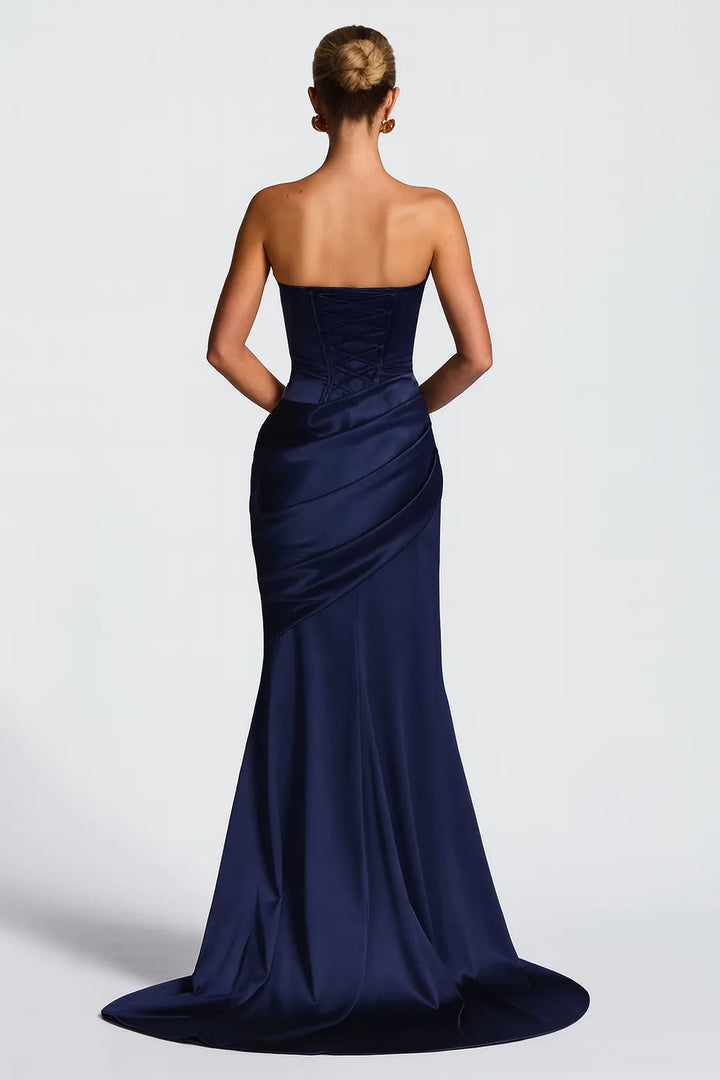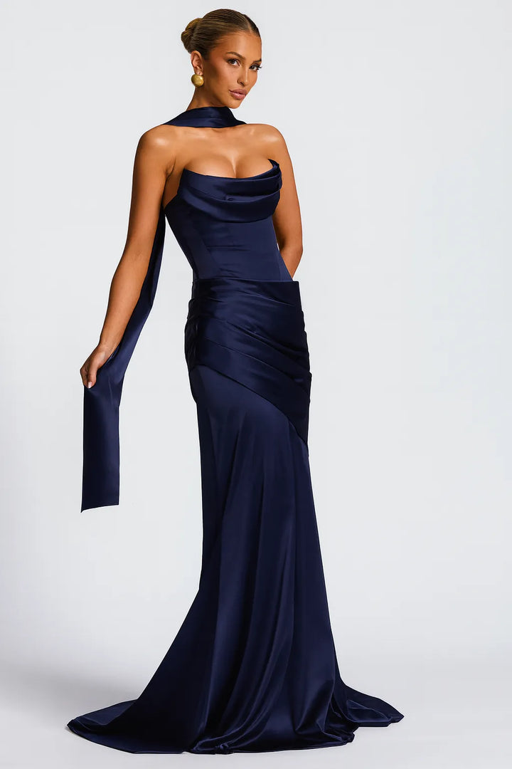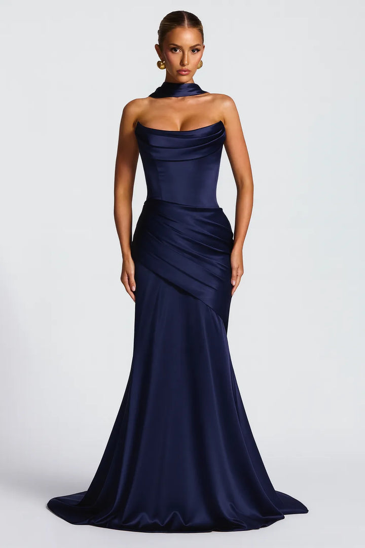 O Vestido Longo Azul Formal Elegance é a escolha perfeita para mulheres que buscam elegância refinada e presença marcante. Com gola choker integrada e decote tomara-que-caia com drapeado horizontal, esta peça em azul marinho profundo combina sofisticação clássica e tecido acetinado luxuoso para um visual deslumbrante em qualquer ocasião especial.