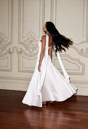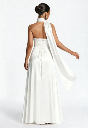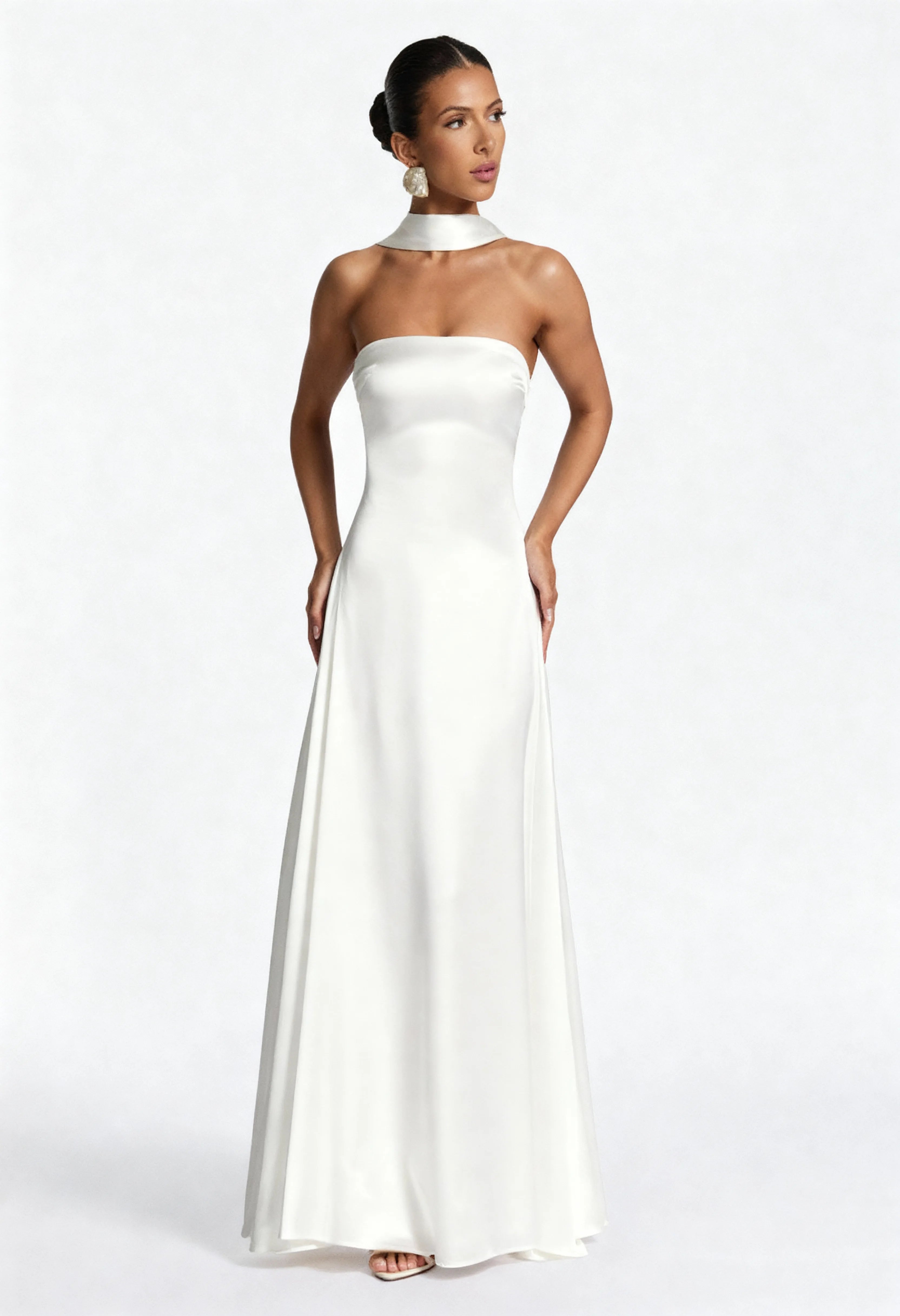 O Vestido Longo Branco Divine Atemporal é a escolha perfeita para mulheres que buscam sofisticação atemporal com design moderno e minimalista. Com gola choker estruturada, capa fluida dramática e modelagem sereia impecável em cetim premium, esta peça em branco puro combina elegância contemporânea e glamour clássico para um visual deslumbrante em casamentos, festas e eventos especiais.