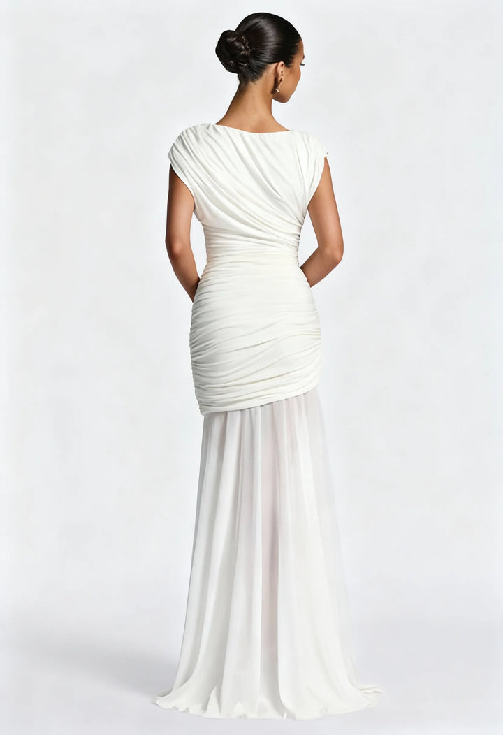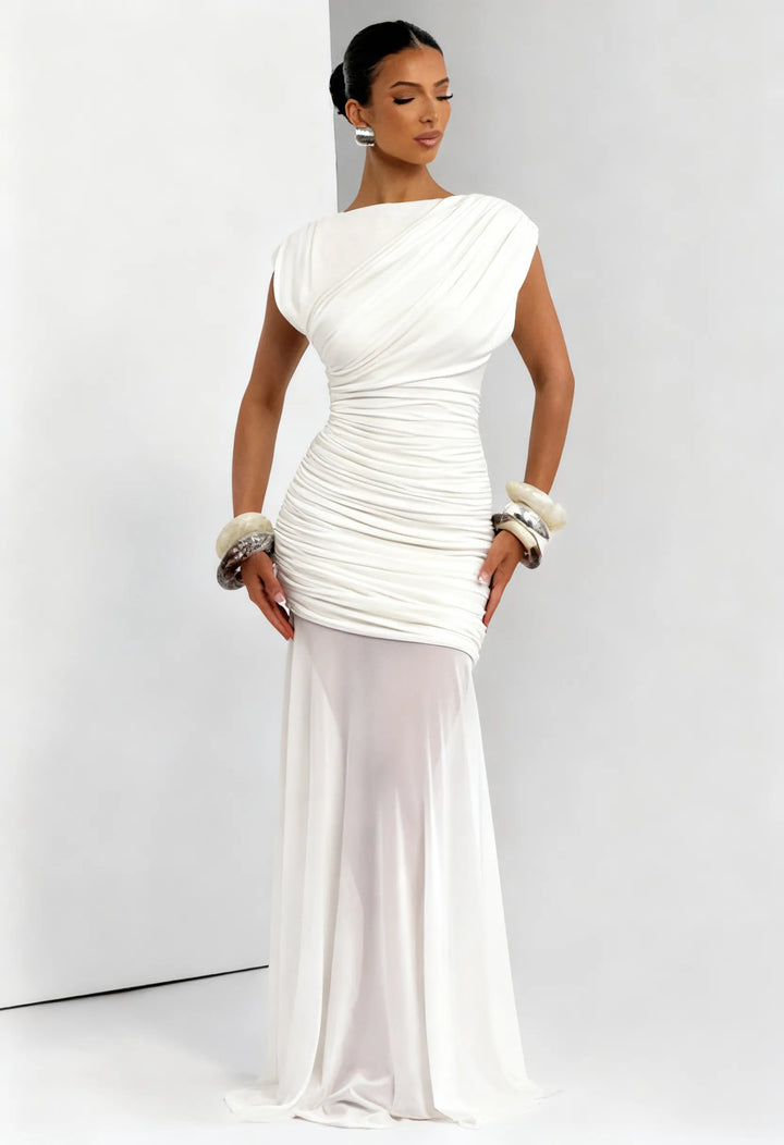 O Vestido Longo Branco Goddess Drape é a escolha perfeita para mulheres que buscam elegância escultural com drapeados dramáticos. Com drapeados diagonais, cintura super marcada e saia longa evasê, esta peça combina inspiração grega clássica e design moderno para um visual deslumbrante em qualquer ocasião especial.