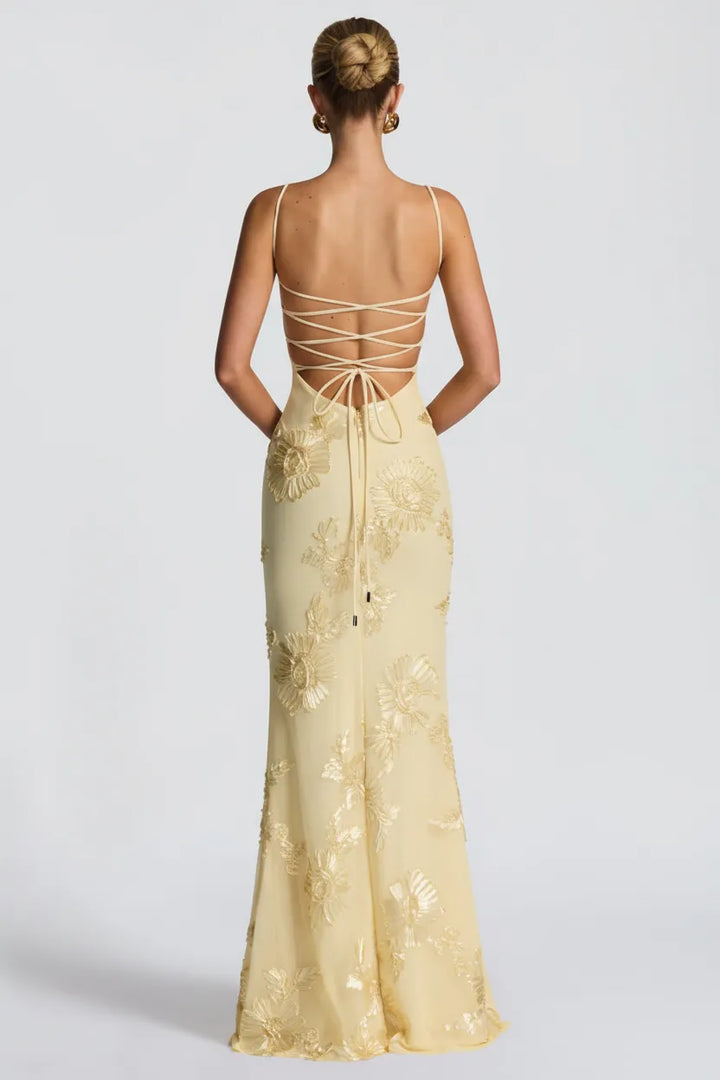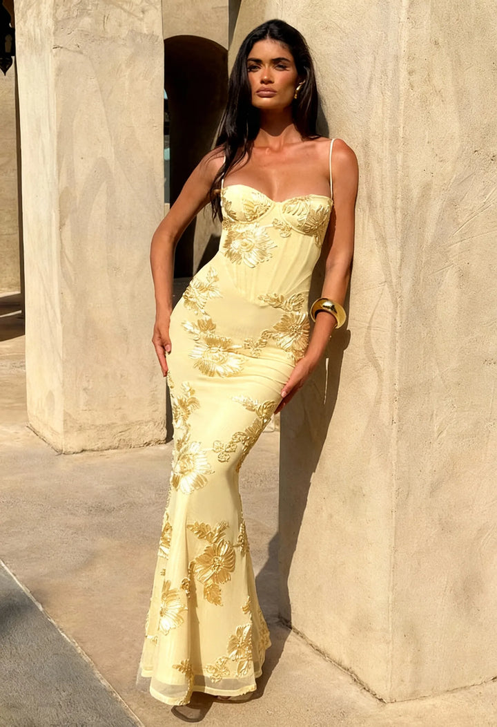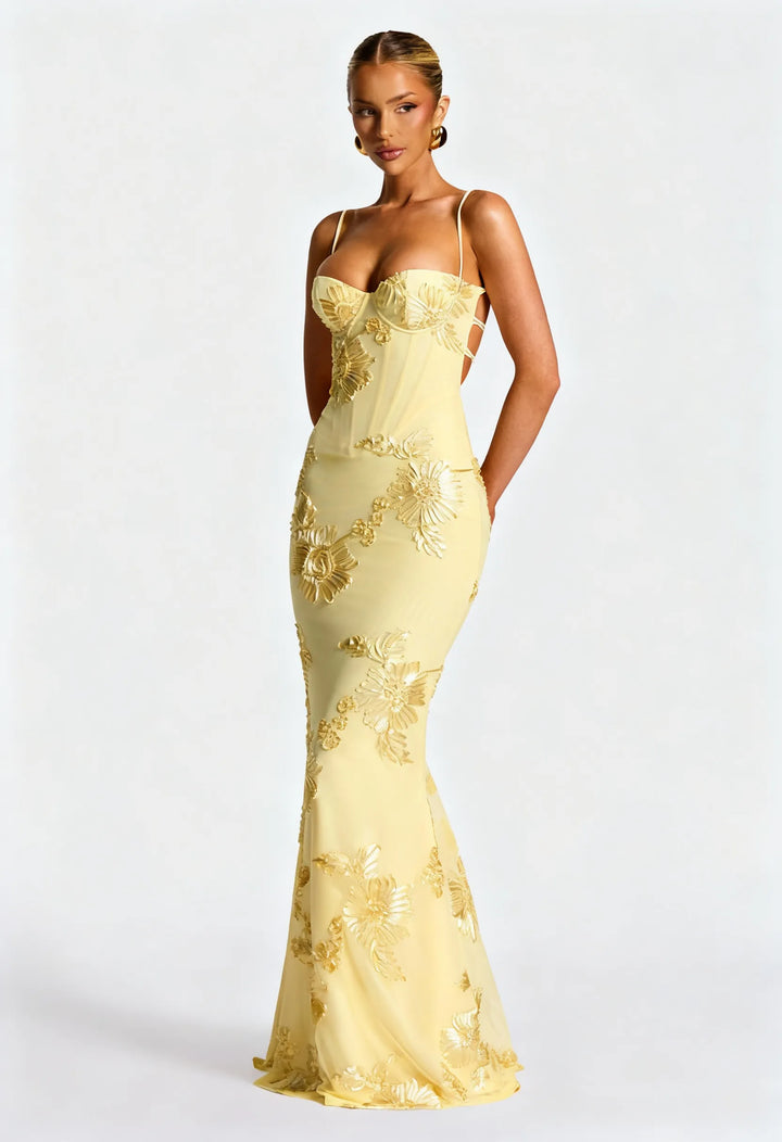 O Vestido Longo Amarelo Golden Bloom é a escolha perfeita para mulheres que buscam romantismo luxuoso com bordados florais exuberantes. Com bordados dourados em relevo, costas com amarração cruzada e modelagem sereia impecável, esta peça em amarelo suave combina feminilidade e sofisticação para um visual deslumbrante em qualquer ocasião especial.