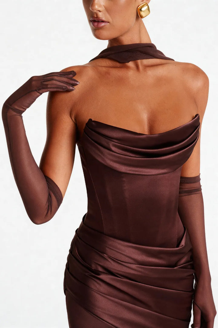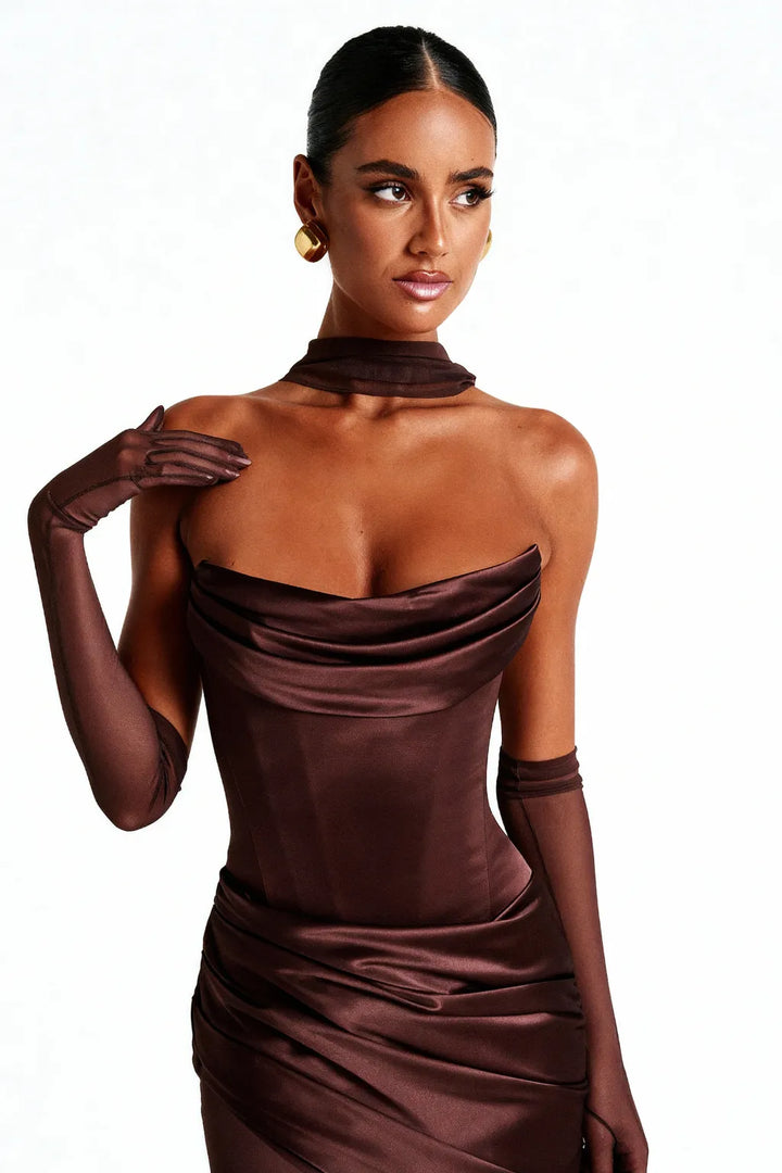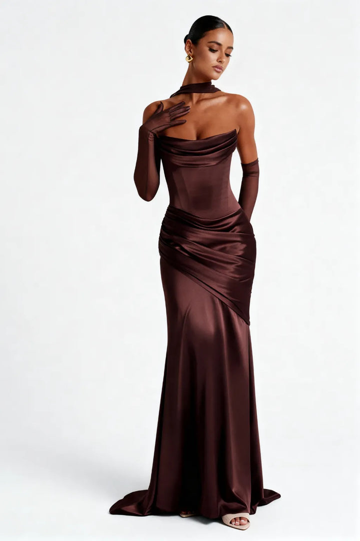 O Vestido Longo Marrom Elegance é a escolha perfeita para mulheres que buscam elegância de alta-costura. Com decote tomara-que-caia drapeado e modelagem sereia esculpida, esta peça em tecido acetinado luxuoso garante um visual deslumbrante e sofisticado em qualquer ocasião especial.