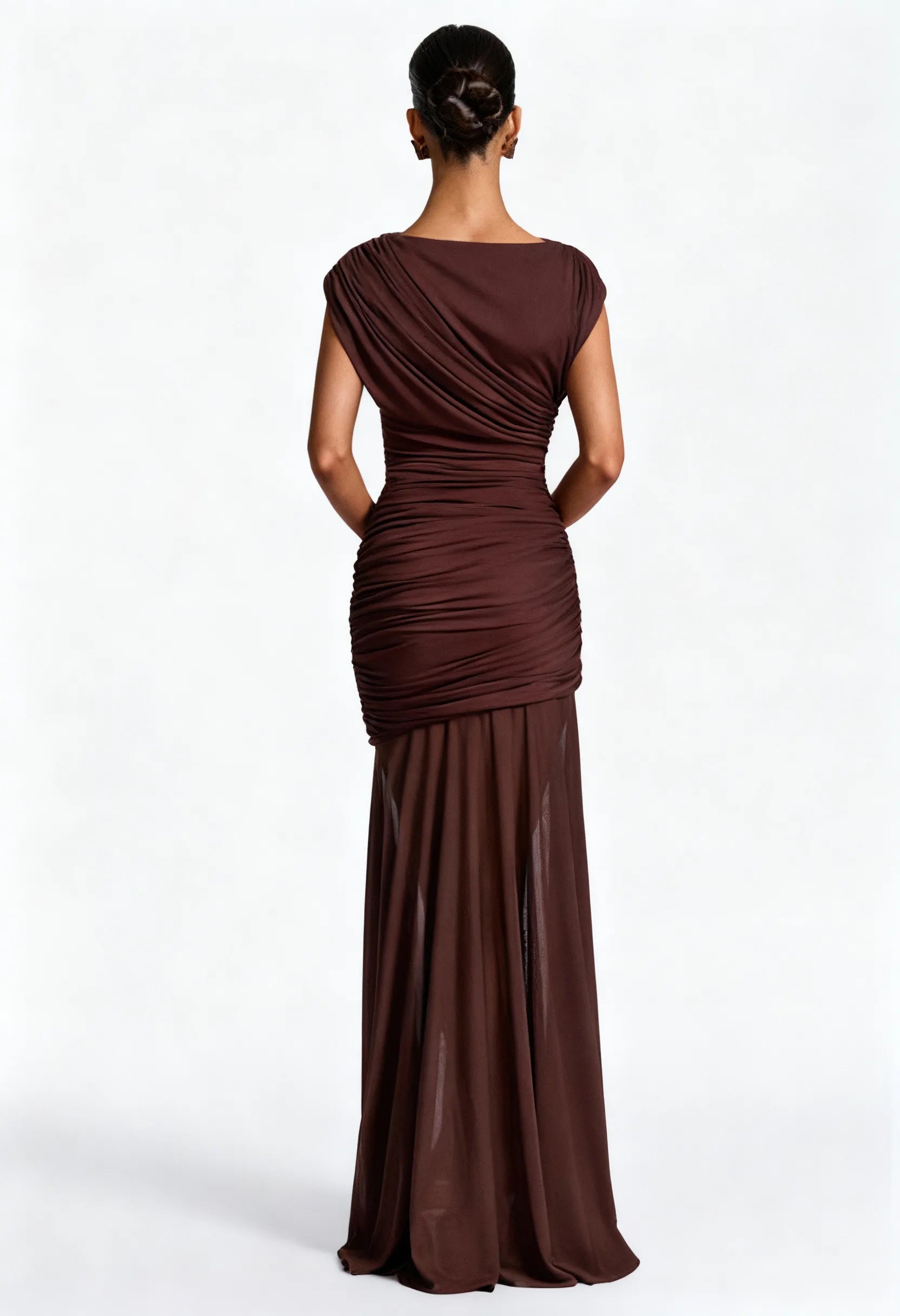 - Drapeados diagonais em camadas no corpete para efeito escultural