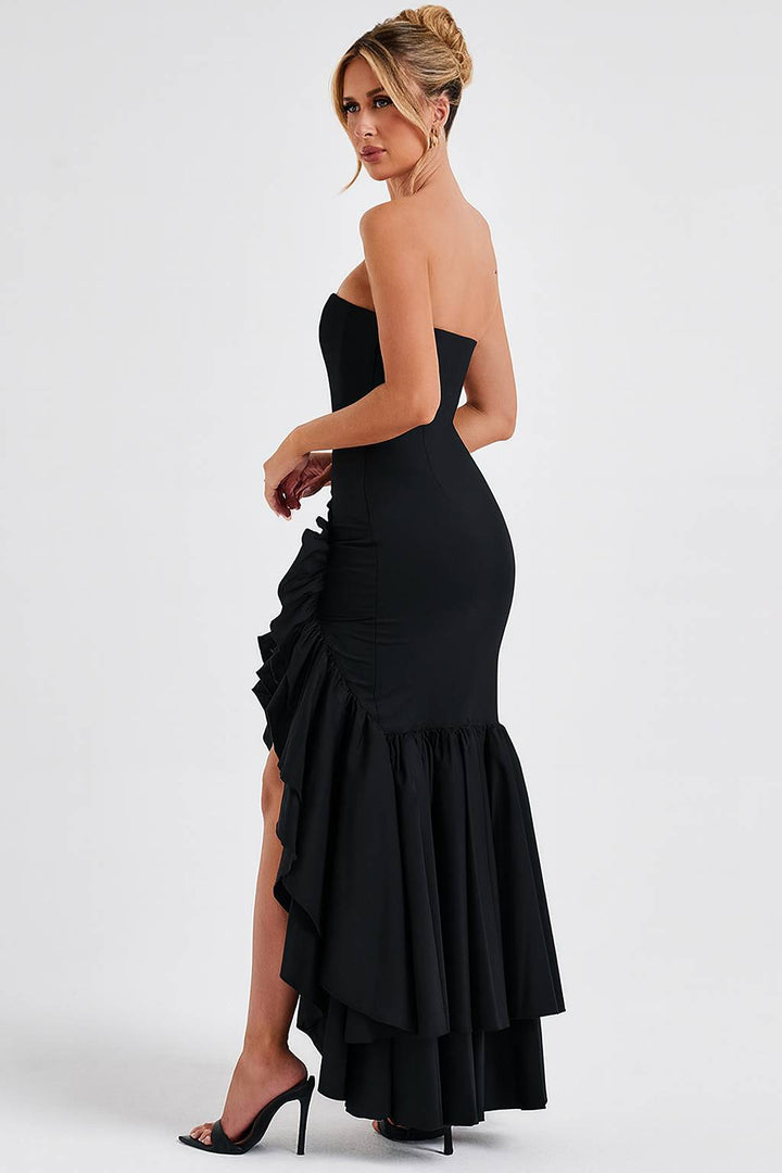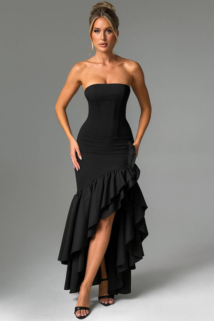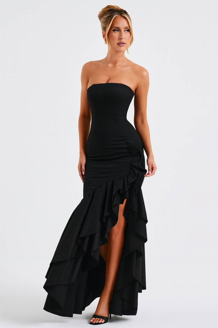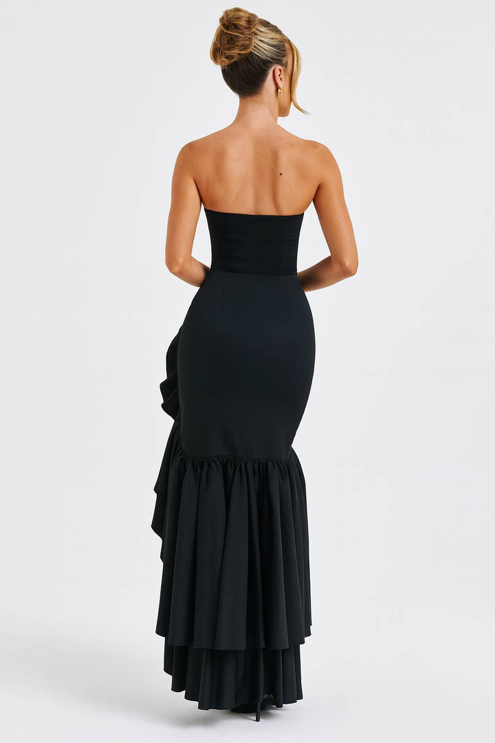 O Vestido Longo Preto Cascata Imperial é a escolha perfeita para mulheres que buscam sofisticação clássica com drama contemporâneo. Com decote tomara-que-caia estruturado e saia assimétrica com babados em cascata, esta peça atemporal combina elegância e impacto visual para um visual deslumbrante em qualquer ocasião especial.