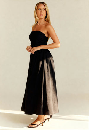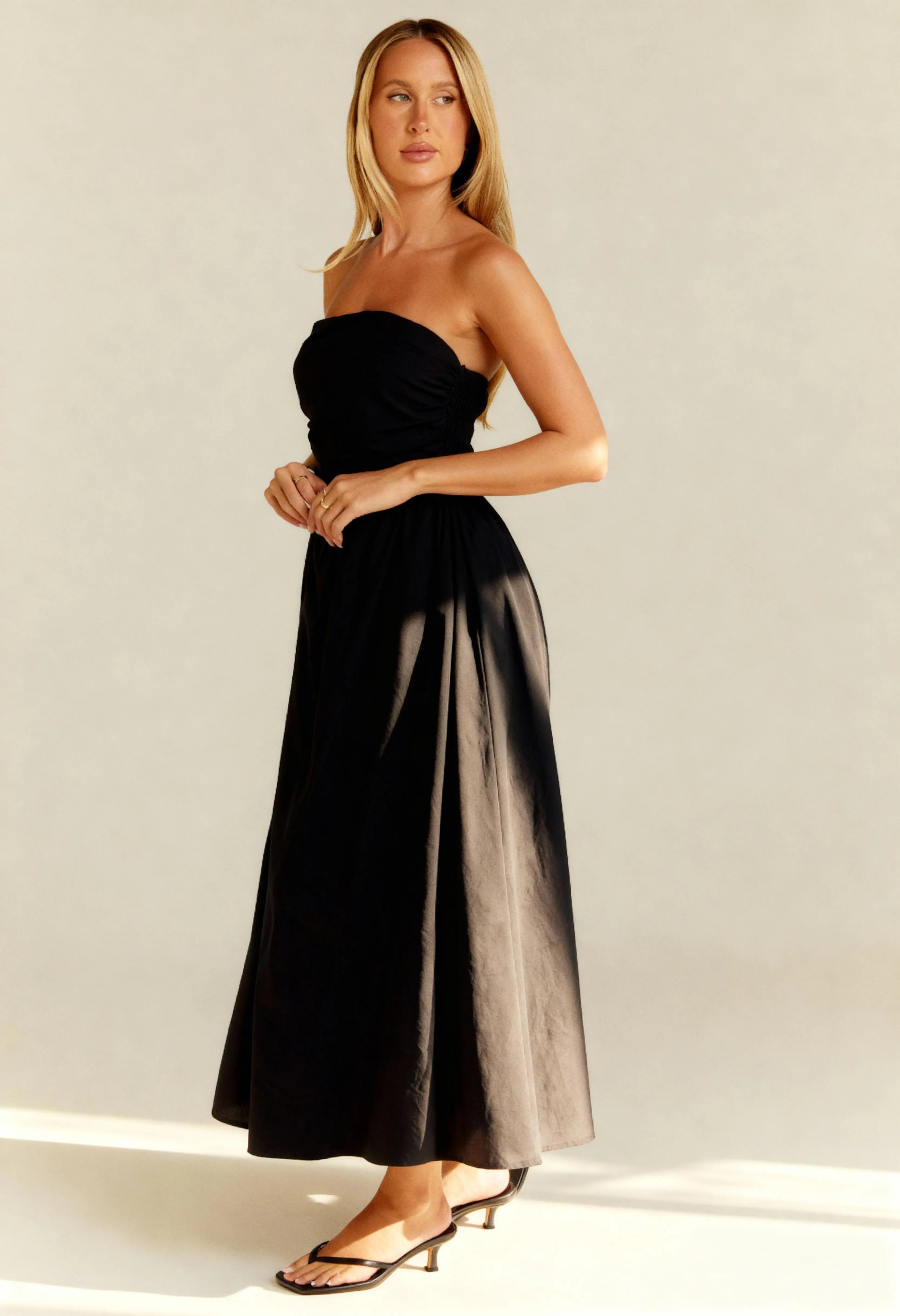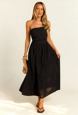 O Vestido Longo Preto Luna Verão é a escolha perfeita para mulheres que buscam elegância romântica com toque descontraído e sofisticado. Com corpete tomara que caia drapeado, cintura marcada com faixa e saia midi franzida em linho premium, esta peça em branco puro combina leveza natural e feminilidade atemporal para um visual deslumbrante em eventos ao ar livre, casamentos na praia, festas de verão e ocasiões especiais.