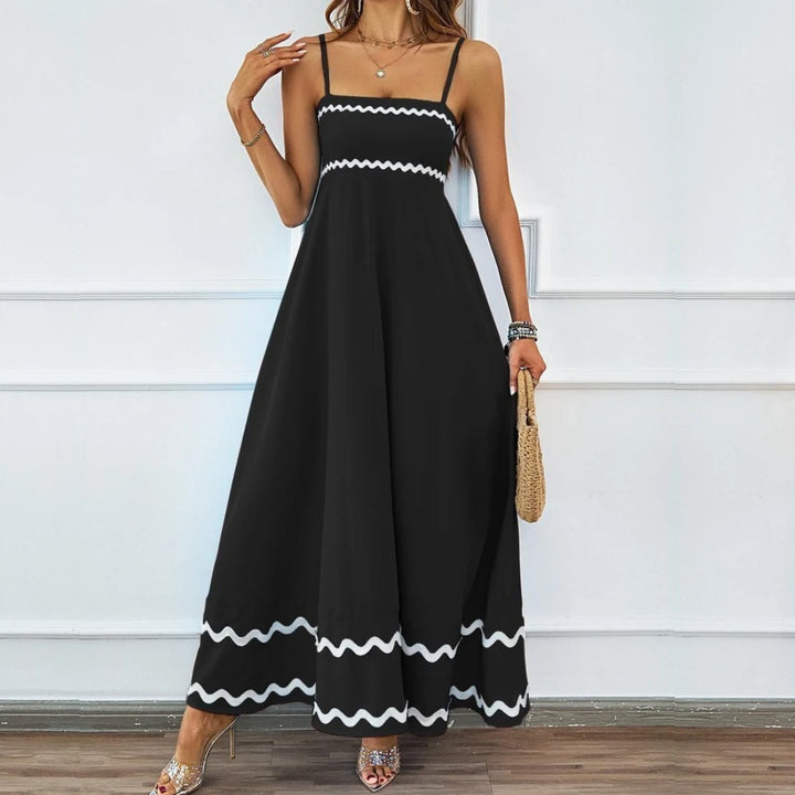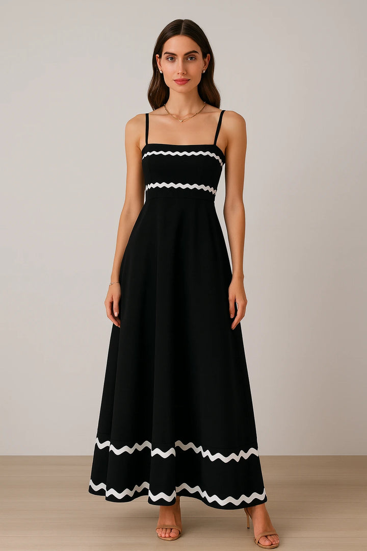 O Noir Riviera traduz a sofisticação descontraída das férias na Côte d’Azur. O busto reto com trançado zigue-zague em branco desenha o colo com frescor, enquanto as alças finas e o recorte logo abaixo do busto criam um efeito empire que alonga a silhueta. A saia longa e ampla exibe na barra o mesmo acabamento em zigue-zague — um toque náutico luxuoso que confere movimento e personalidade ao preto absoluto do tecido.