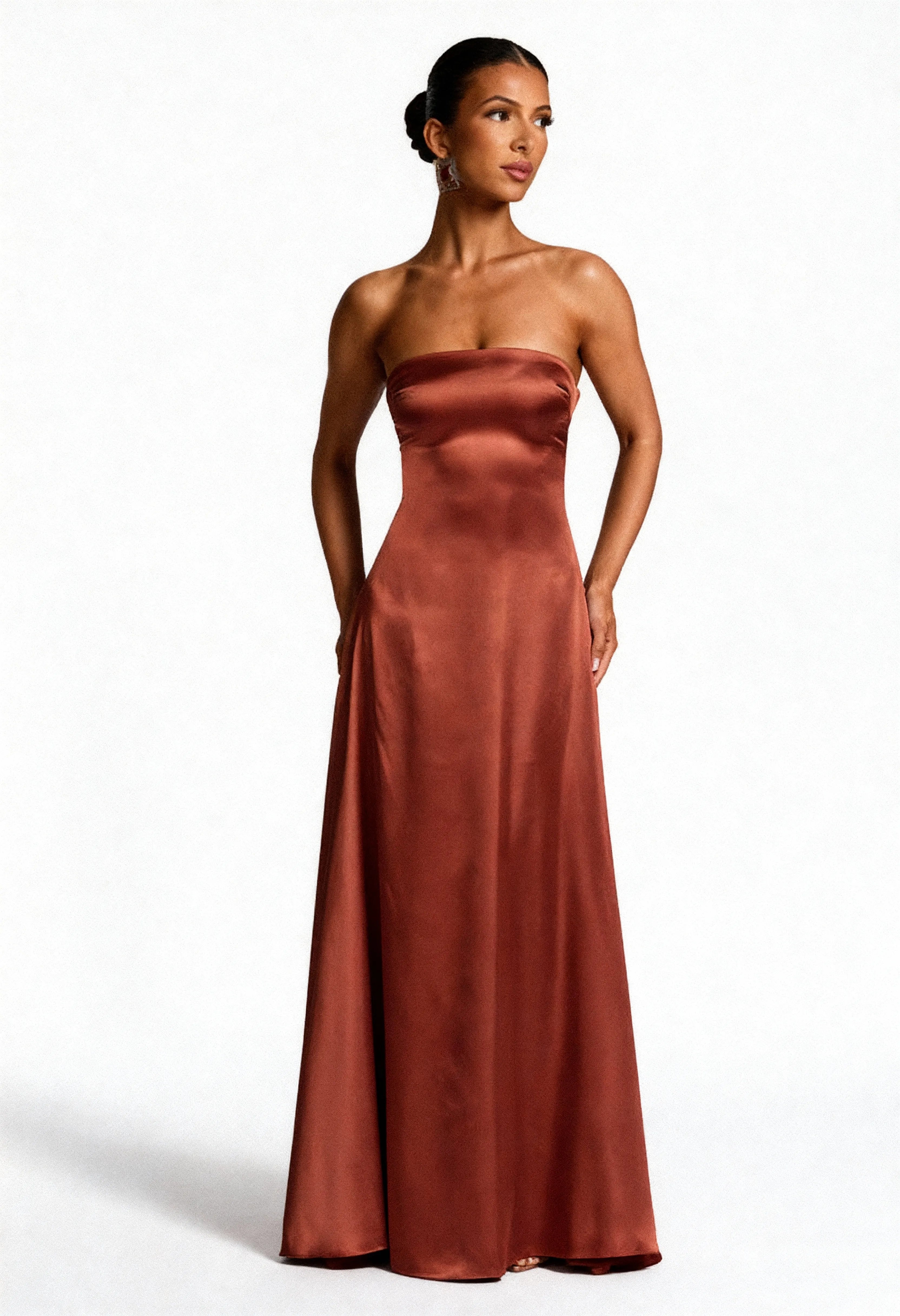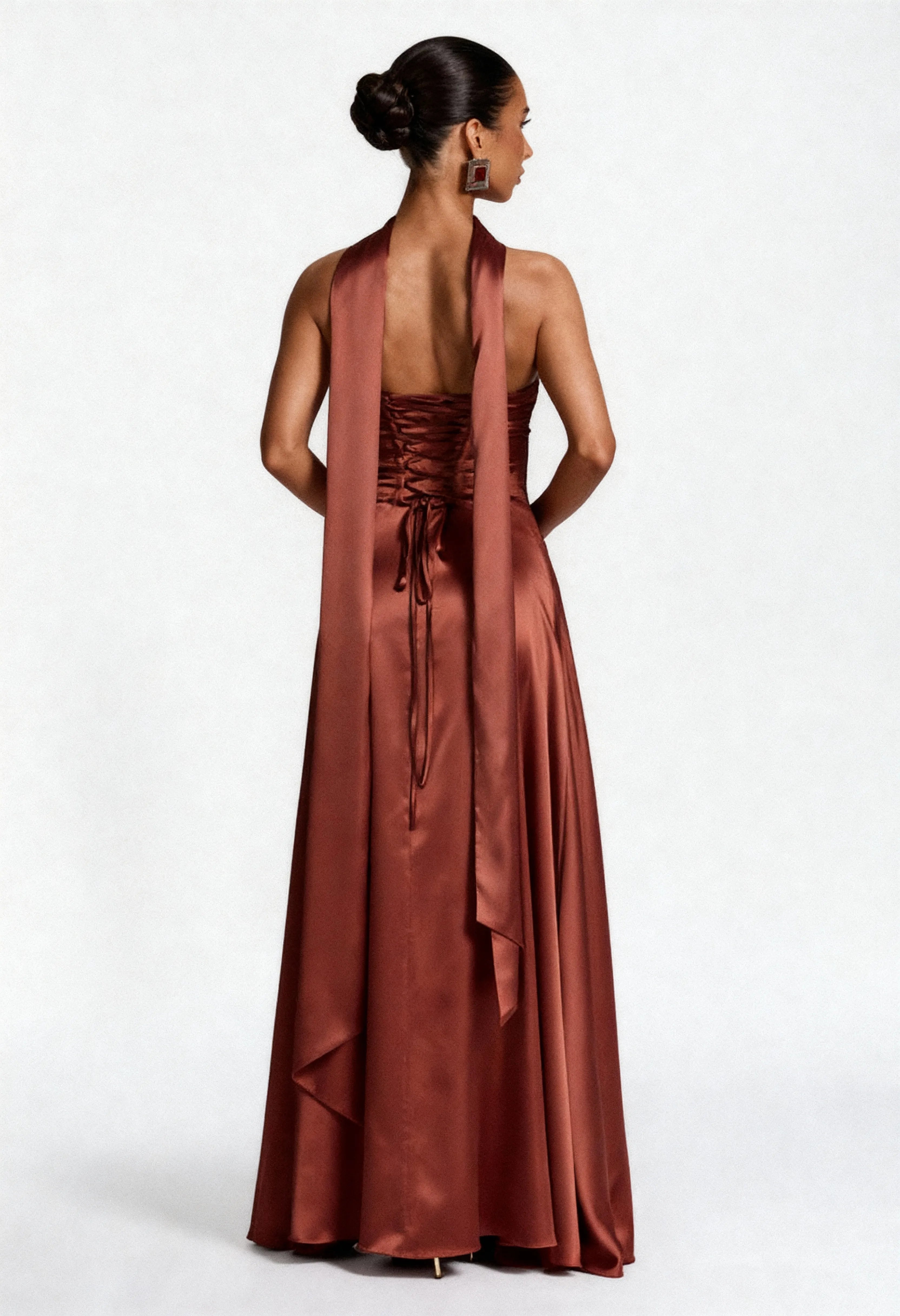 O Vestido Longo Terroso Divine Atemporal é a escolha perfeita para mulheres que buscam sofisticação atemporal com design moderno e minimalista. Com gola choker estruturada, capa fluida dramática e modelagem sereia impecável em cetim premium, esta peça em bronze sofisticado combina elegância contemporânea e glamour clássico para um visual deslumbrante em casamentos, festas e eventos especiais.
