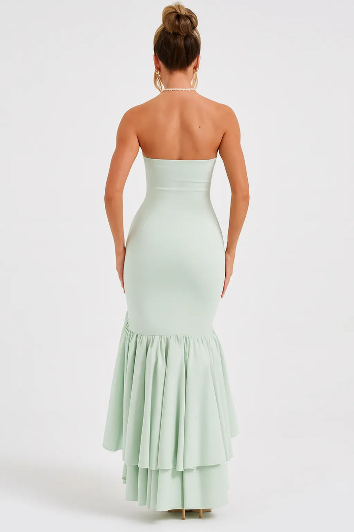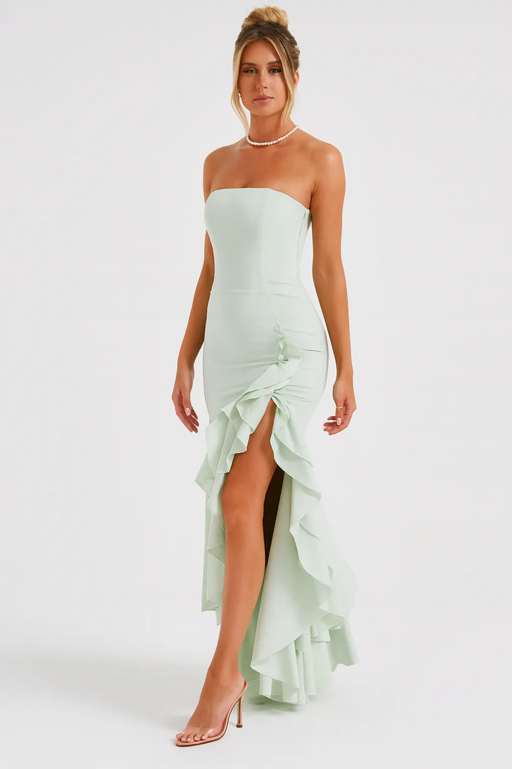 O Vestido Longo Verde Cascata Imperial é a escolha perfeita para mulheres que buscam elegância romântica com drama contemporâneo. Com decote tomara-que-caia estruturado e saia assimétrica com babados em cascata, esta peça em verde menta delicado combina suavidade e impacto visual para um visual deslumbrante em qualquer ocasião especial.