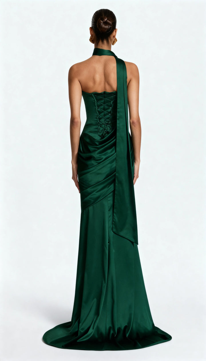 O Vestido Longo Verde Elegance é a escolha perfeita para mulheres que buscam elegância impactante e sofisticação de tapete vermelho. Com gola choker integrada e decote tomara-que-caia drapeado, esta peça em verde esmeralda vibrante com tecido acetinado luxuoso garante presença marcante em qualquer ocasião especial.