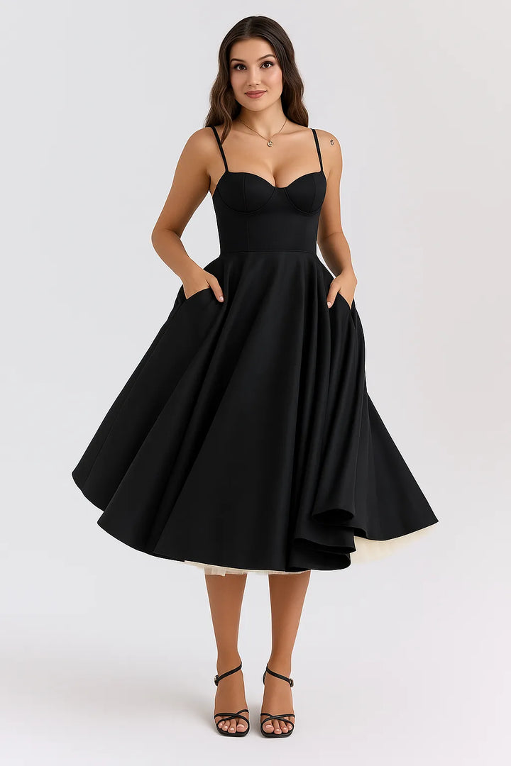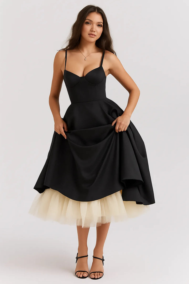 O Vestido Midi Preto Noir Belle Époque é a escolha perfeita para mulheres que buscam sofisticação dramática com elegância clássica. Com bustier balconette estruturado, delicado filete de renda marfim e saia midi godê volumosa, esta peça combina luxo atemporal e design couture para um visual deslumbrante em qualquer ocasião especial.
