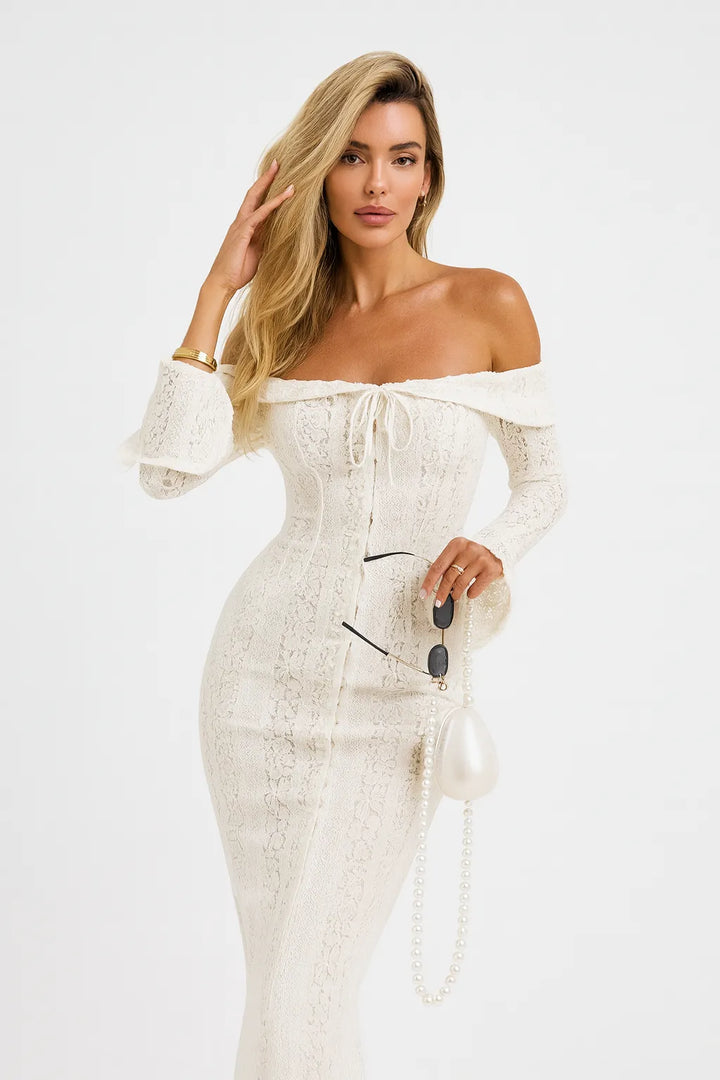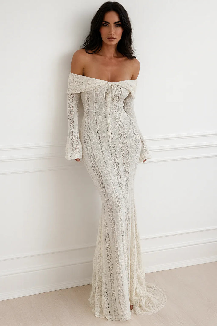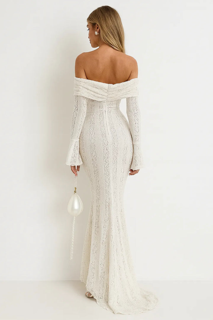 O Vestido Longo Branco Pérola Versailles é a escolha perfeita para mulheres que buscam romantismo delicado com charme vintage. Com decote ombro a ombro, renda floral por toda a peça e mangas longas em sino, este vestido combina feminilidade e sofisticação para um visual deslumbrante em qualquer ocasião especial.