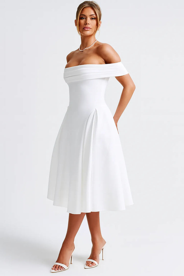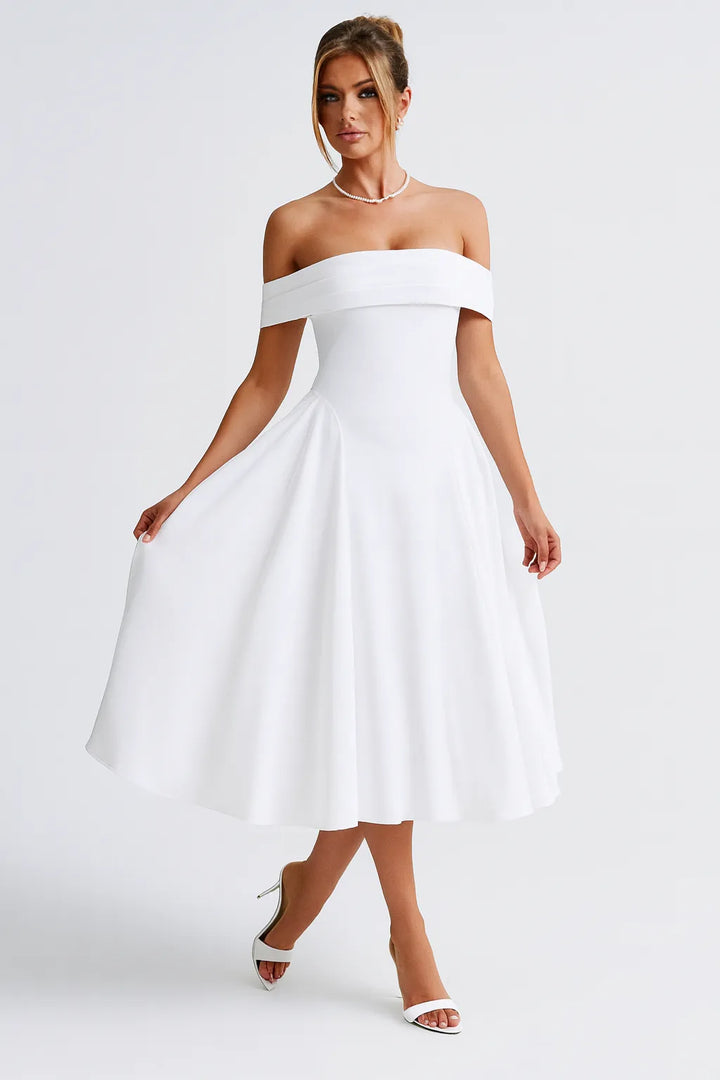 O Vestido Midi Branco Valentina é a escolha perfeita para mulheres que buscam sofisticação com um toque de sensualidade. Com decote ombro a ombro estruturado e silhueta evasê, esta peça realça a feminilidade com elegância e garante presença marcante em qualquer ocasião especial.
