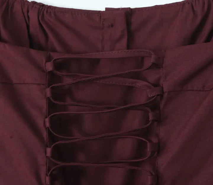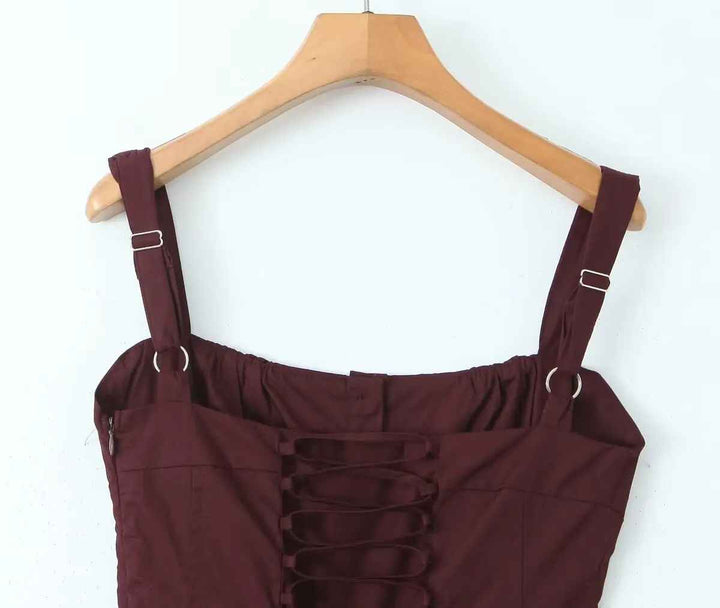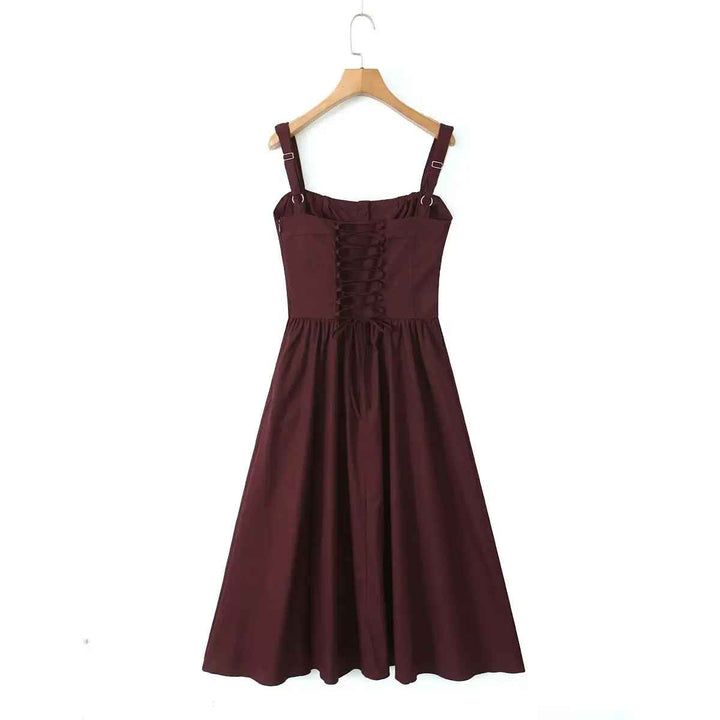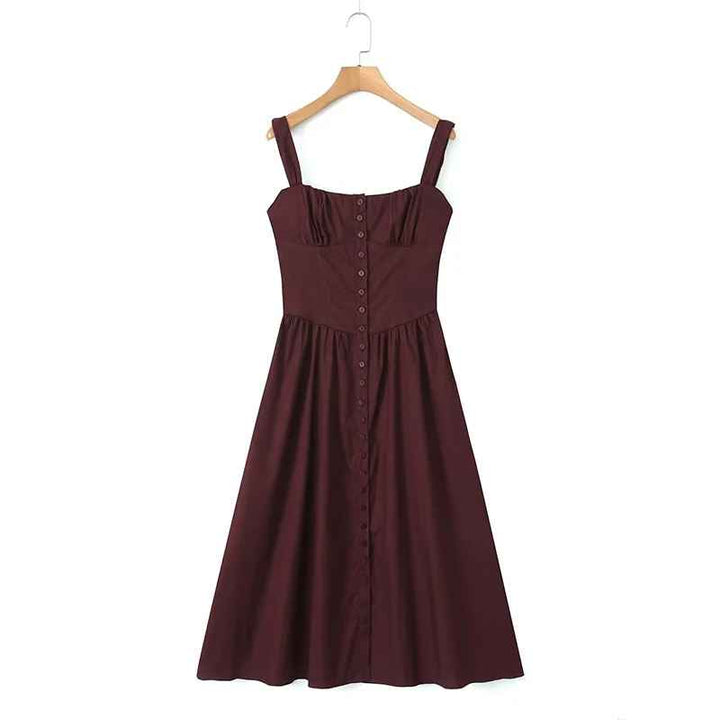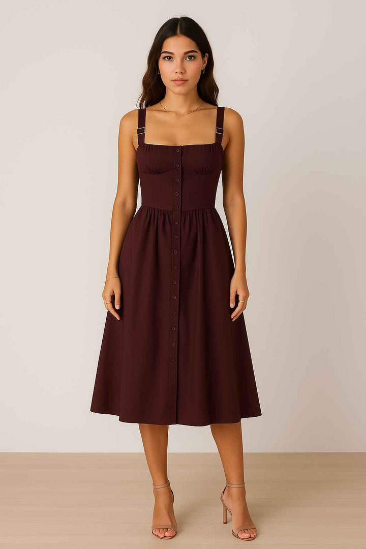 O Marsala Botanique foi criado para mulheres que apreciam detalhes de alfaiataria aliados a uma feminilidade suave. O corpo estruturado realça o colo com franzido sutil, enquanto as alças largas com fivela metálica permitem ajuste perfeito. A fileira de botões forrados percorre todo o centro, criando uma linha vertical que alonga a silhueta. A saia midi evasê garante movimento gracioso e conforto absoluto — tudo isto em um marsala profundo que valoriza todos os tons de pele e atravessa as estações com charme atemporal.