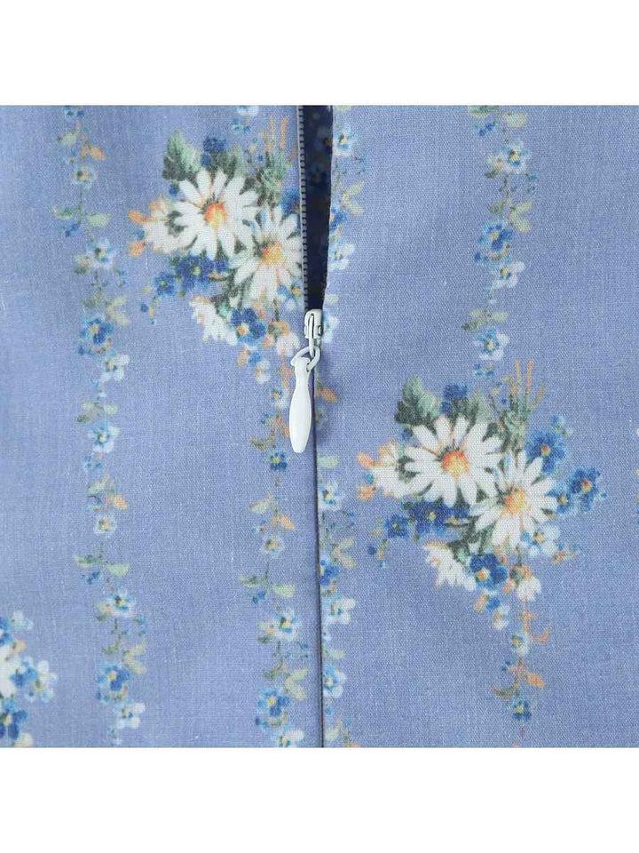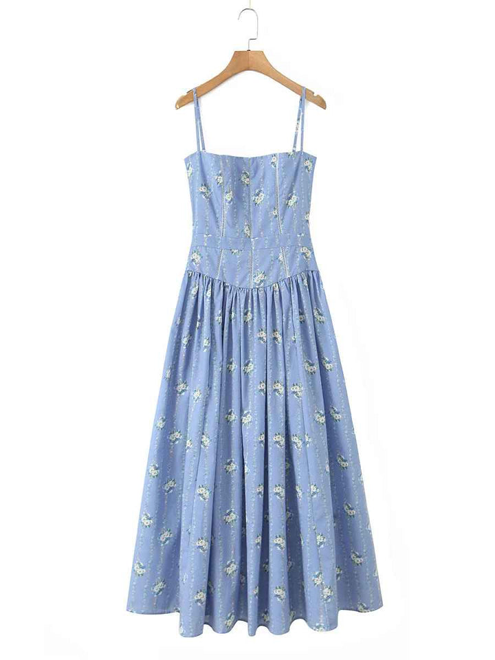 Azul sereno com flores miúdas, decote reto e saia midi ampla: feminilidade clássica com frescor contemporâneo.